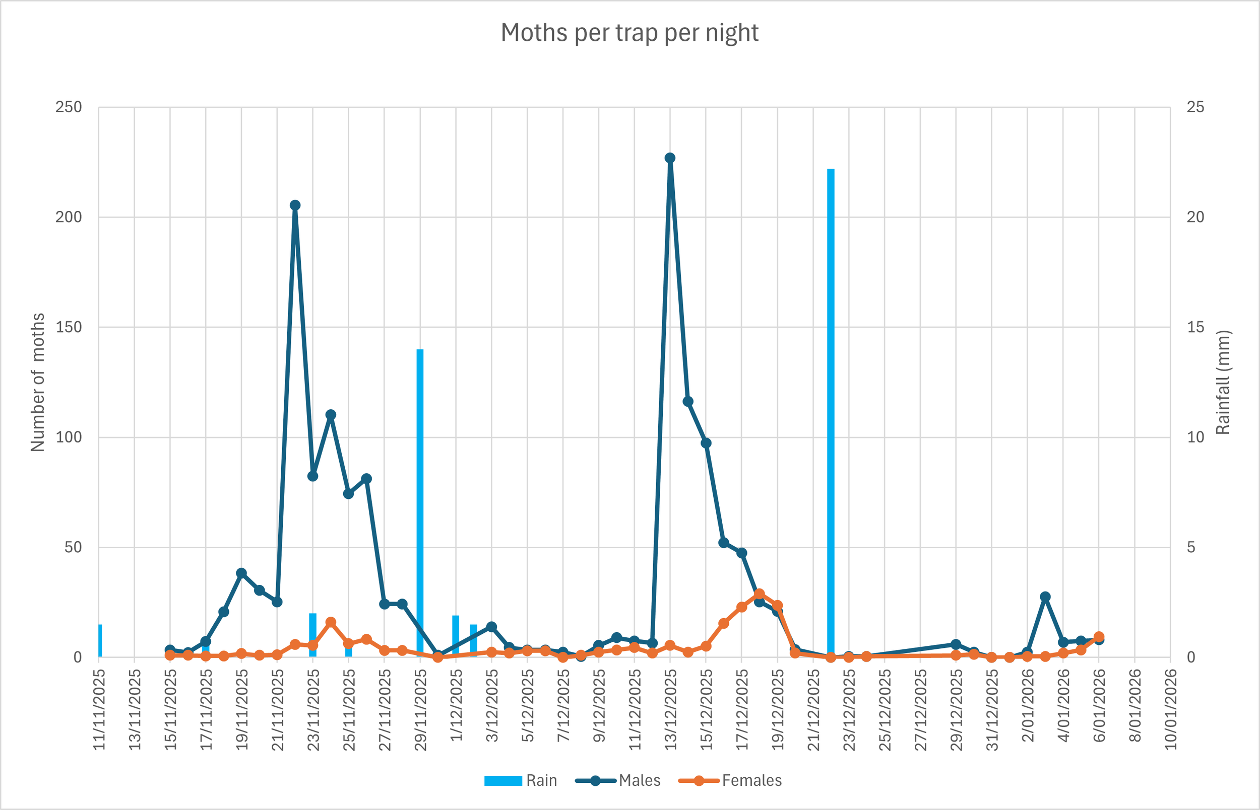 From previous years, there seems to be some alignment with rainfall. Peaks of moths follow 10-14 days after rainfall (or looking at our trap data, maybe the moths can predict rainfall??). This year, the leading rainfall event on 11th November was tiny. Perhaps this resulted in a “false start” because this year was the first year we recorded a double peak, one around the 22nd November and the second around the 13th December 2025 after rain on the 29th November.