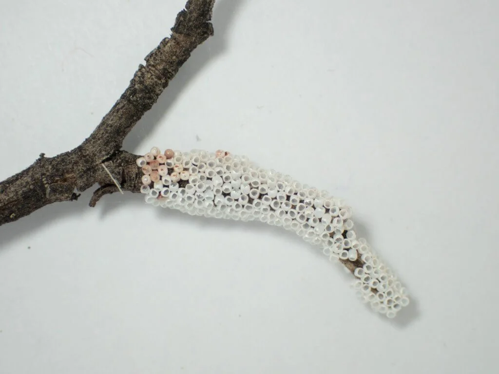 A Mallee Looper egg mass on a twig, these eggs have hatched.