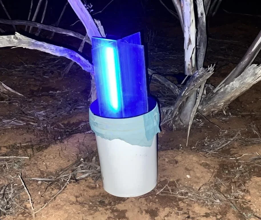 For the light and power source: I use a 240V replacement light for bug zappers 50W Gecko brand (about $30). It is fitted into an Arlec 60W handheld work light housing with a 5m lead ($15). I plug it into a power point with an extension lead or a battery with inverter like the Powertech 155W power station ($220).